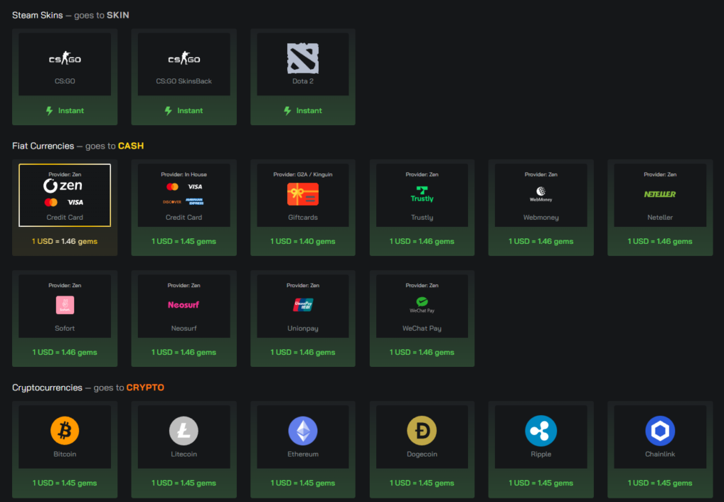 | Withdrawal Methods | Cryptos, PayPal, Skins |