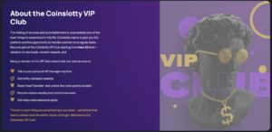 In conclusion, CoinSlotty offers a rich and dynamic gaming experience, supported by its extensive game library, cryptocurrency integration, and a robust VIP program. However, potential players should consider the platform’s focus on cryptocurrencies and the geographic restrictions that might affect accessibility.